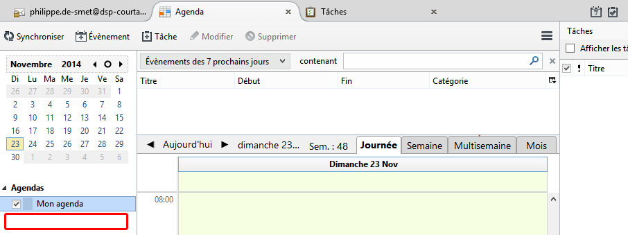 Emplacement : https://documents.dsp-courtage.sfr/remote.php/caldav/calendars/[nom d'utilisateur]/[nom d'utilisateur]